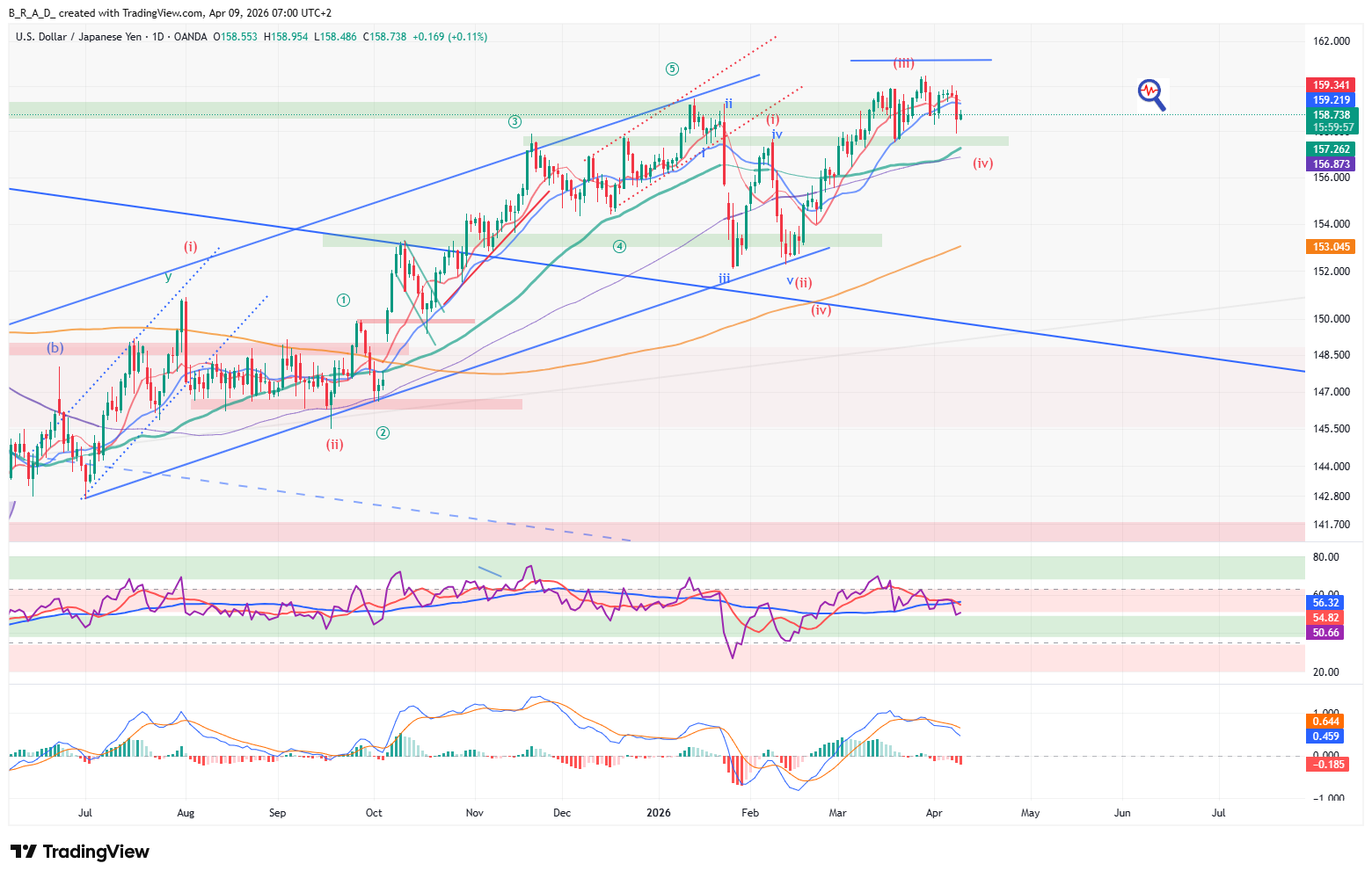 A következő időszakban esésre számítunk, az elsődleges célár 157,651. A támasz elérését követően fordulat következhet be és emelkedés érkezhet a piacra, melynek az elsődleges célára 160,010.