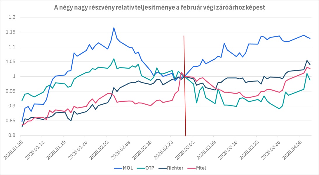 Akkor mire fel ez a jó teljesítmény? Ha a négy nagy részvényt nézzük — amely az index cirka 90 százalékát adja — akkor azt láthatjuk, hogy a MOL, amely elvileg profitálhatna a szituációból, ha kapna olajat és nem lenne árstop, közel van a történelmi csúcsához. Azt pedig ráadásul még idén év elején sikerült elérni. A Richter, amelynek nincs direkt függése a háborútól, de például az orosz kitettségen (magas olajár) azért mégis érezhet hatást, újabb és újabb csúcsra emelkedett az elmúlt időszakban, amelyben igazából a saját egyedi története a nőgyógyászat üzletágban a felhajtóerő jelenleg.