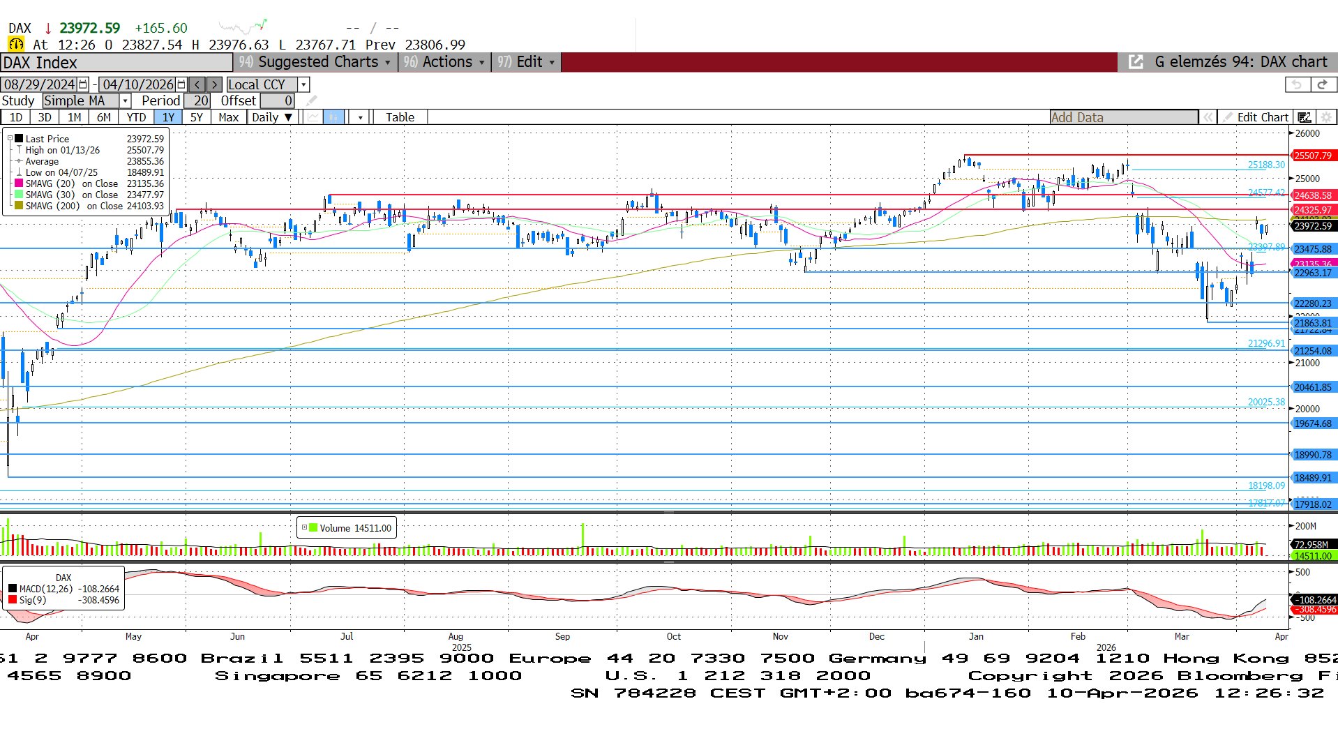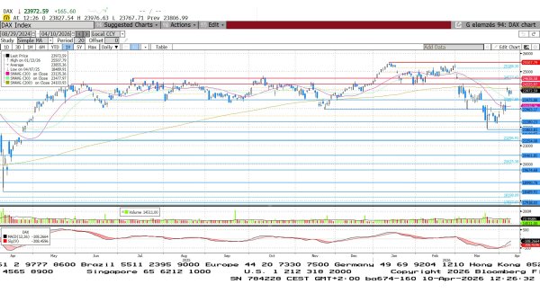 A közel-keleti helyzet rendeződésének esélye az energiaimportra szoruló európai országokban is pozitív hangulatot eredményezett. A DAX kitört a negatív trendből és felfelé indult. Az elmúlt napokban megérkezett a 200 napos mozgóátlag alá, ami egy időre megálljt parancsolhat, de a háború lezárásának reménye újabb vételi hullámot indíthat.