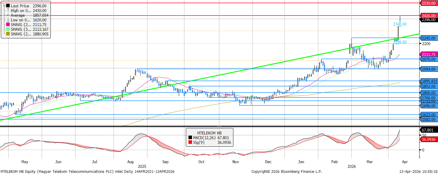 Kivételt képvisel az MTel, hiszen a négy blue-chip papír közül ez az egyetlen, ami nem tudott új abszolút csúcsra emelkedni ma, de ezzel együtt is egészen 2000-ig kell visszamennünk, hogy a maihoz hasonló árfolyamszinteket láthassunk. Egy ősrégi ellenállást tesztelt ma le a részvény, azonban a 2.426 forintnál húzódó szintet nem sikerült áttörnie. A következő napokban érdemes lesz figyelni, hogy megpróbálkozik-e a kitöréssel, vagy megelégszik az oldalazással a lefordulást követően.
