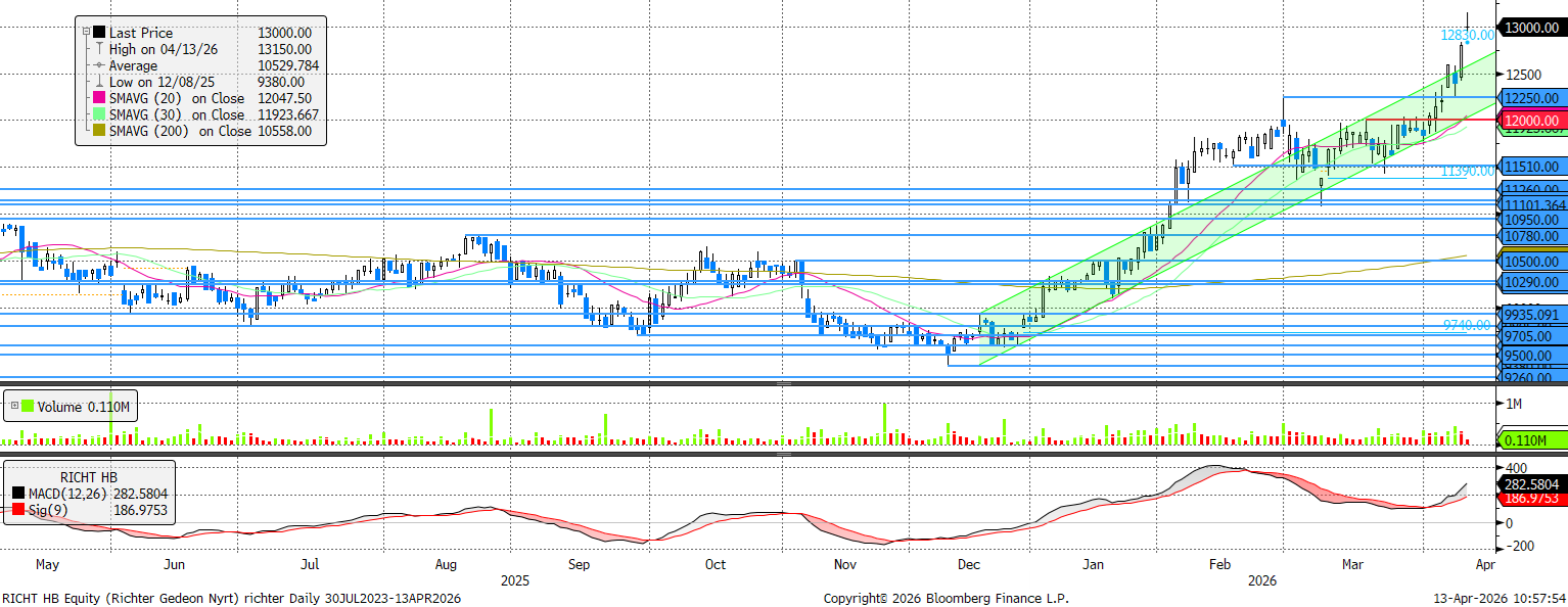 A magyar részvénypiacot körül lengő eufória a Richter értékelésére is pozitívan hat. A másik oldalról viszont az erős forint nem tesz jót a forintban számított árbevételnek, hiszen a cég bevételeinek mintegy 90%-a exportból származik. Így nem meglepő módon a blue-chip papírok közül lemaradó ma a Richter. A következő napokban érdemes lesz közelről vizsgálni az árfolyam alakulását, mivel érdekes technikai formációk is kirajzolódhatnak, miután a történelmi csúcsról réssel pattant el ma reggel az árfolyam. Ez lehet szökési rés, ami további jelentős emelkedés irányába mutathat, de ugyanígy kialakulhat akár egy fordulós jelzés is. Ez egyelőre még nyitott kérdés.