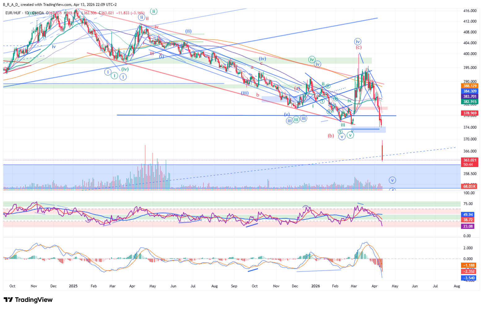 A következő időszakban további esésre számítunk, az elsődleges célár 360,90, a másodlagos 358,50.