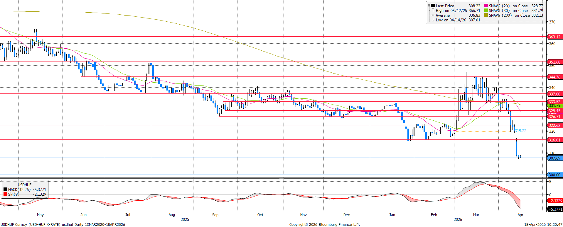 Az USDHUF korrekcióját lényegesen felgyorsította a parlamenti választások eredménye. Hasonlóan az EURHUF-hoz, négy éve nem látott erő van a forint mögött, a 307,7-es támaszig jött le az árfolyam ritkán látott, 1%-nak megfelelő rést hagyva maga után. Bár önmagát beteljesítő jóslat, hogy a réseket betölti az árfolyammozgás, az oldalazás tűnik valószínűbbnek rövidtávon.