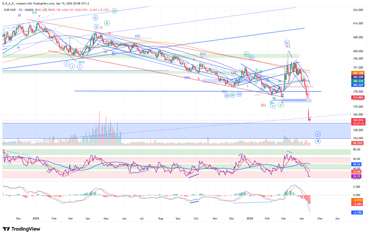 A következő időszakban további esésre számítunk, az elsődleges célár 360,90, a másodlagos 358,50.