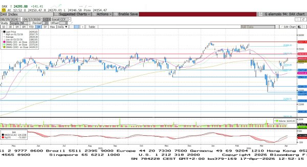 A DAX is folytatta a felpattanását, és sikeresen áttörte a 200 napos mozgóátlagot. A menetelésnek egyelőre megálljt parancsolt a 24.326 pontnál húzódó ellenállás, de hamarosan ismét nekifuthat az index. Túlvettség nem alakult ki, és azt MACD indikátor is felfelé mutat, ami további emelkedésre utal. Az iráni háború lezárása segítené a kilátások javulását, így a figyelem most a béketárgyalásra irányul, amire hétvégén kerülhet sor az USA és Irán között.