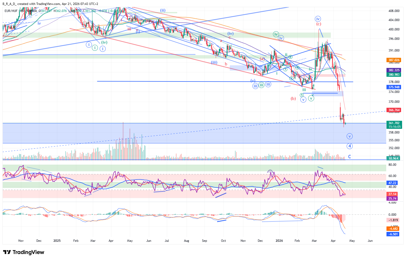 A következő időszakban folytatódhat a lassulás, korrekció indulhat, ezért a 357,50-365,60 közötti sávban mozoghat a legnagyobb eséllyel a hazai fizetőeszköz árfolyama.