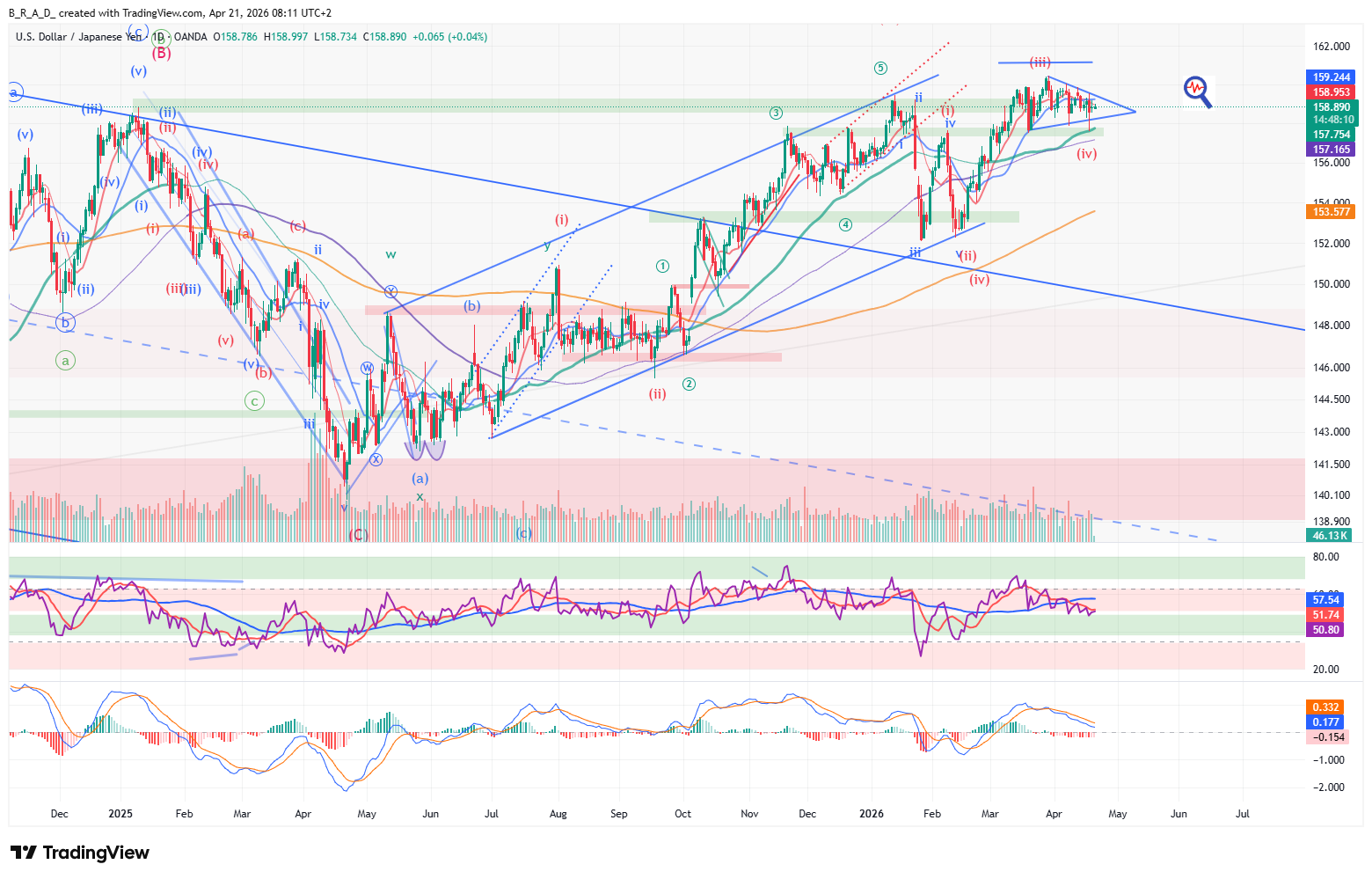 Kialakult egy short indikátor-konfiguráció, amely még nem kapott megerősítést, a formáció célára 156,700, elérési valószínűség 60%. Jelen esetben arra számítunk, hogy a megerősítés nem következik be vagy nagyon hamar besül a setup.