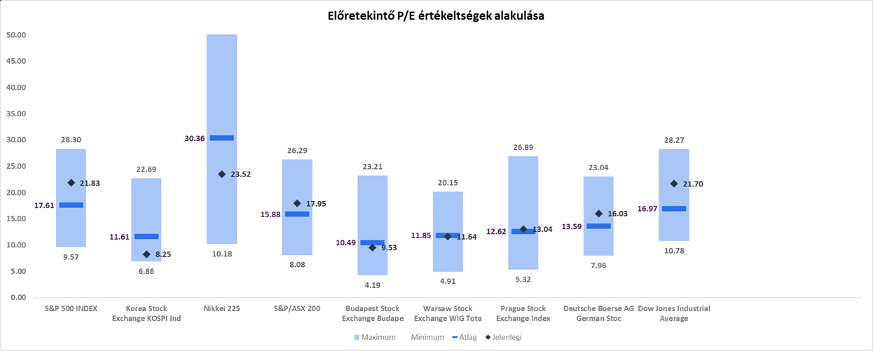 A BUX és más indexek értékeltsége az előremutató P/E alapján