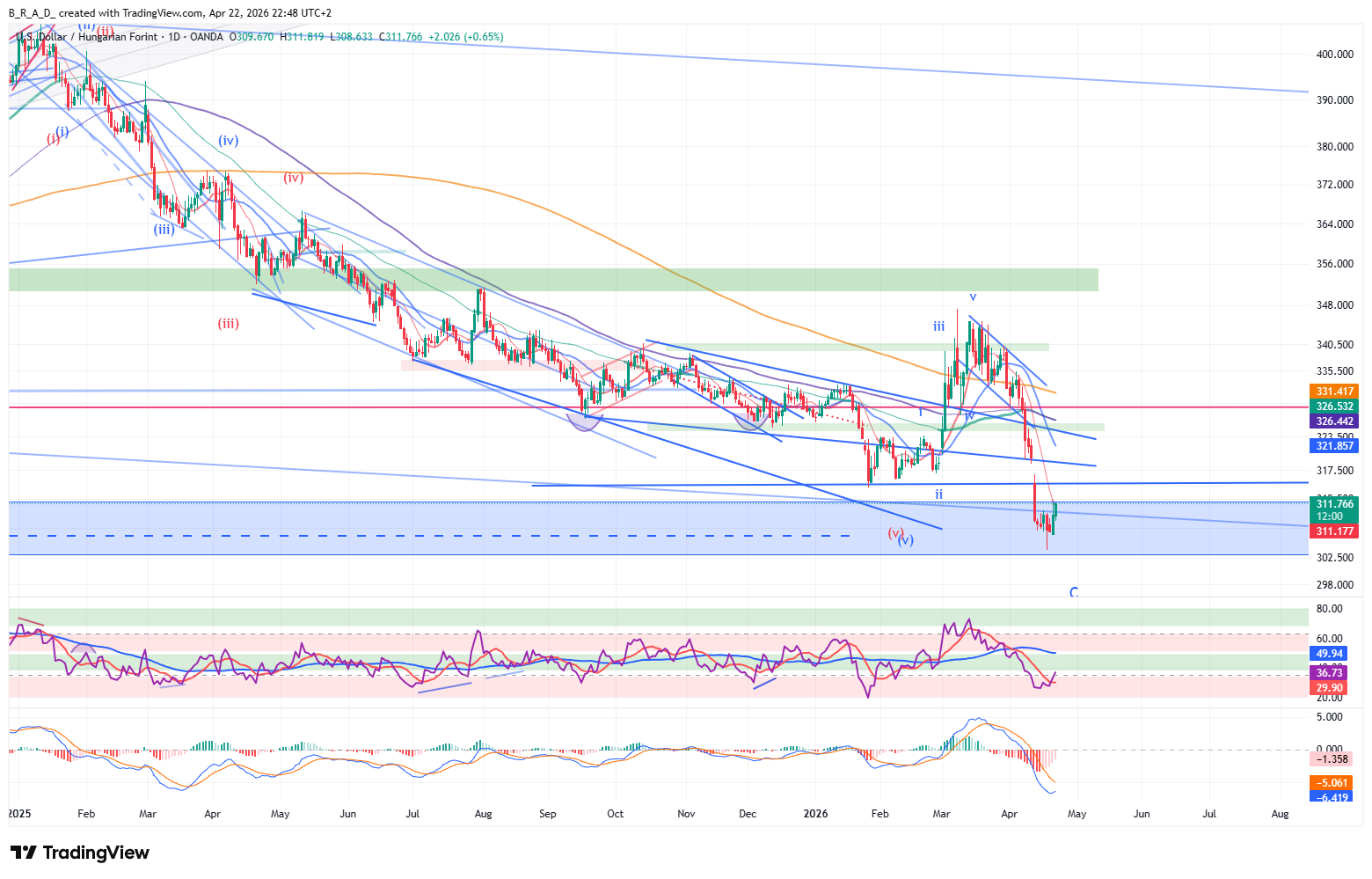 A következő időszakban korrekció folytatására és ezen belül emelkedésre számítunk, az emelkedés elsődleges célára 313,70, a másodlagos 317,50.