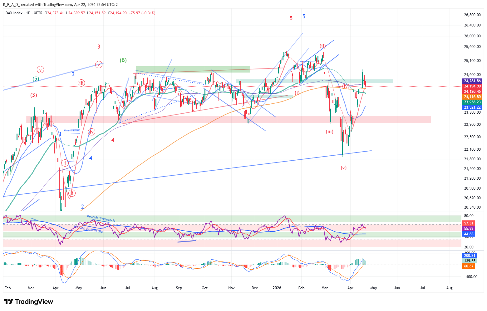 A következő napokban esésre számítunk, az elsődleges célár 24.000, a másodlagos 23.526.