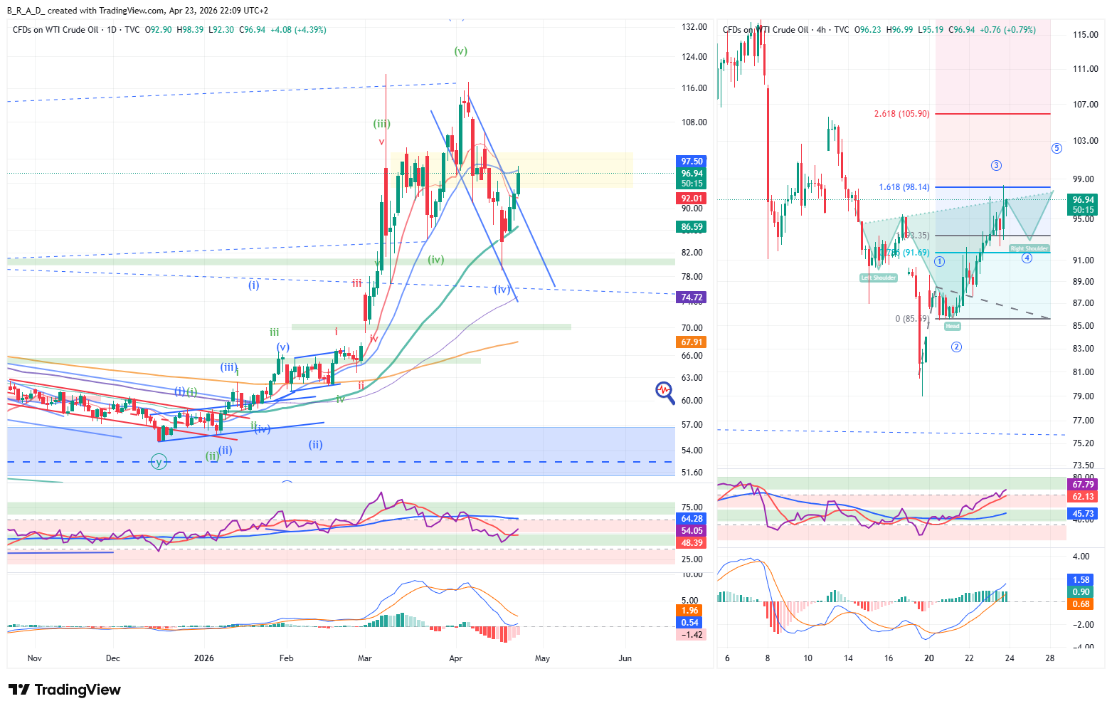 Kitört az eső csatornából a piac és egészen a 20 napos mozgóátlagig emelkedett az árfolyam. Intraday idősíkon egy kisebb ellenállás elé ért a piac, amiből ha lefordul, akkor a későbbiekben esély van arra, hogy létrejöjjön egy klasszikus fej-váll alakzat, amelynek az előzetesen becsült célára 109 magasságába mutat. A technikai alakzat és az elsődleges elliotti szcenáriónk összefüggést mutat.