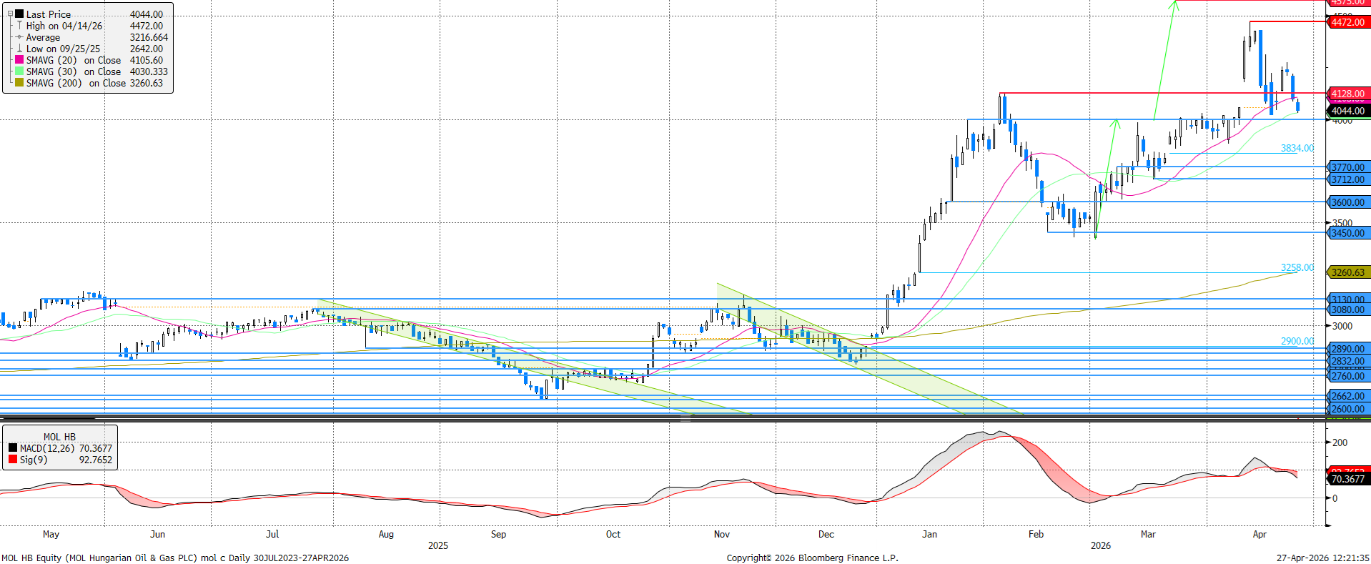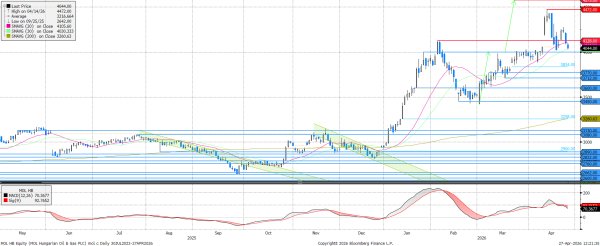 A történelmi csúcsok döntését követően most inkább negatívnak tűnik a hangulat a MOL piacán. A mai eséssel a 20 napos mozgóátlag eltört és egészen a 30 napos mozgóátlagig mérséklődött az árfolyam.