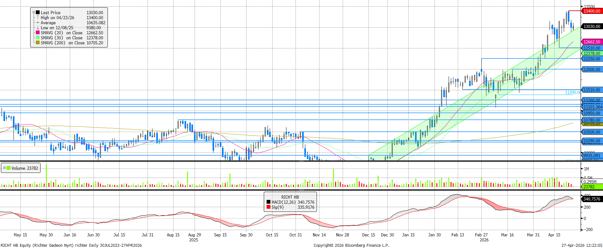 A múlt héten 13.400 forintos árfolyammal új történelmi csúcsot ért el a Richter, azonban a csúcsdöntést követően csütörtökön hirtelen irányt váltott a kurzus. Jelenleg egy korábbi emelkedő trendcsatorna felső élén található az árfolyam, de ez a trendvonal könnyedén eltörhet a következő napokban. A Richter amerikai értékesítési partnere, az AbbVie szerda délután, de még amerikai piacnyitás előtt teszi majd közzé első negyedéves számait. Az elemzői várakozások átlaga alapján a szezonálisa gyenge első negyedévben 868 millió USD lehetett a Vraylar árbevétele.
