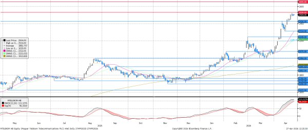 Az MTEL elérte a 2.530 forintos ellenállást, miközben az RSI indikátor 80-as értéke erős túlvettségre utal. Ezek inkább az árfolyamcsökkenés irányába mutatnának. Viszont közel vagyunk az osztalékfizetéshez, hiszen május 7-én lehet utoljára a 154 forintos osztalékszelvénnyel együtt kereskedni a részvényt, és ezt megelőzően jellemző az osztalékrally, ami felülírhatja a technikai képet. A fenti ellentmondások miatt oldalazást valószínűsítünk a következő napokra.