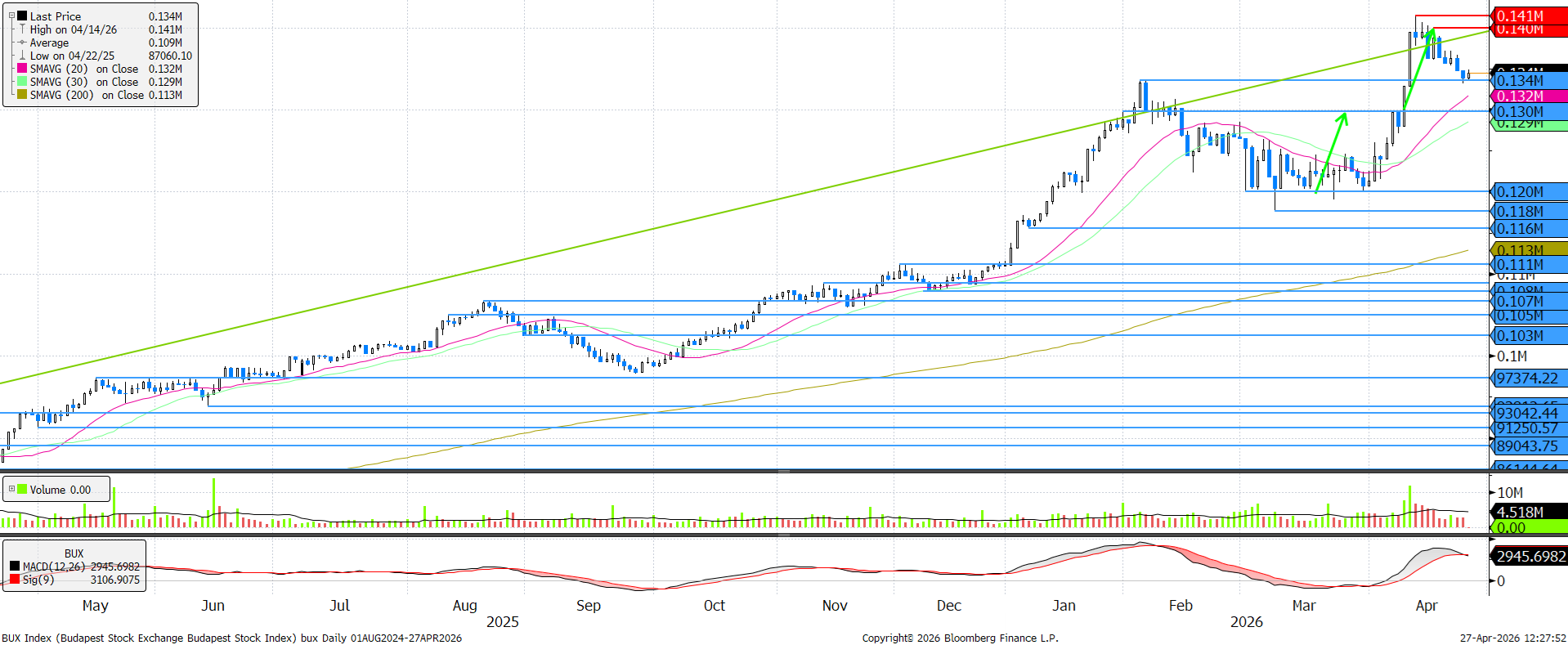 A BUX index visszatesztelte a korábbi, februári csúcsot, mely szintről a következő napokban emelkedéssel próbálkozhatna, bár ez nem lesz könnyű, hiszen az MACD indikátor közben eladási jelzést adott. Az irány nagymértékben azon fog múlni, hogy az OTP-nek tényleg sikerül-e emelkednie, ez esetben a BUX-nál is némi visszafogott emelkedés következhetne.