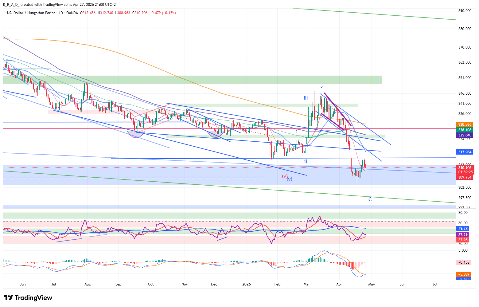 Az RSI a fenntartható bear zónából emelkedett, ezért a mozgást elsődlegesen korrekcióként értelmezzük. Ahhoz, hogy a korrekció, vagy annak első hullámát befejezettnek tudjuk minősíteni, 310 alatt kellene zárnia az árfolyamnak, ez egyelőre nem történt meg.