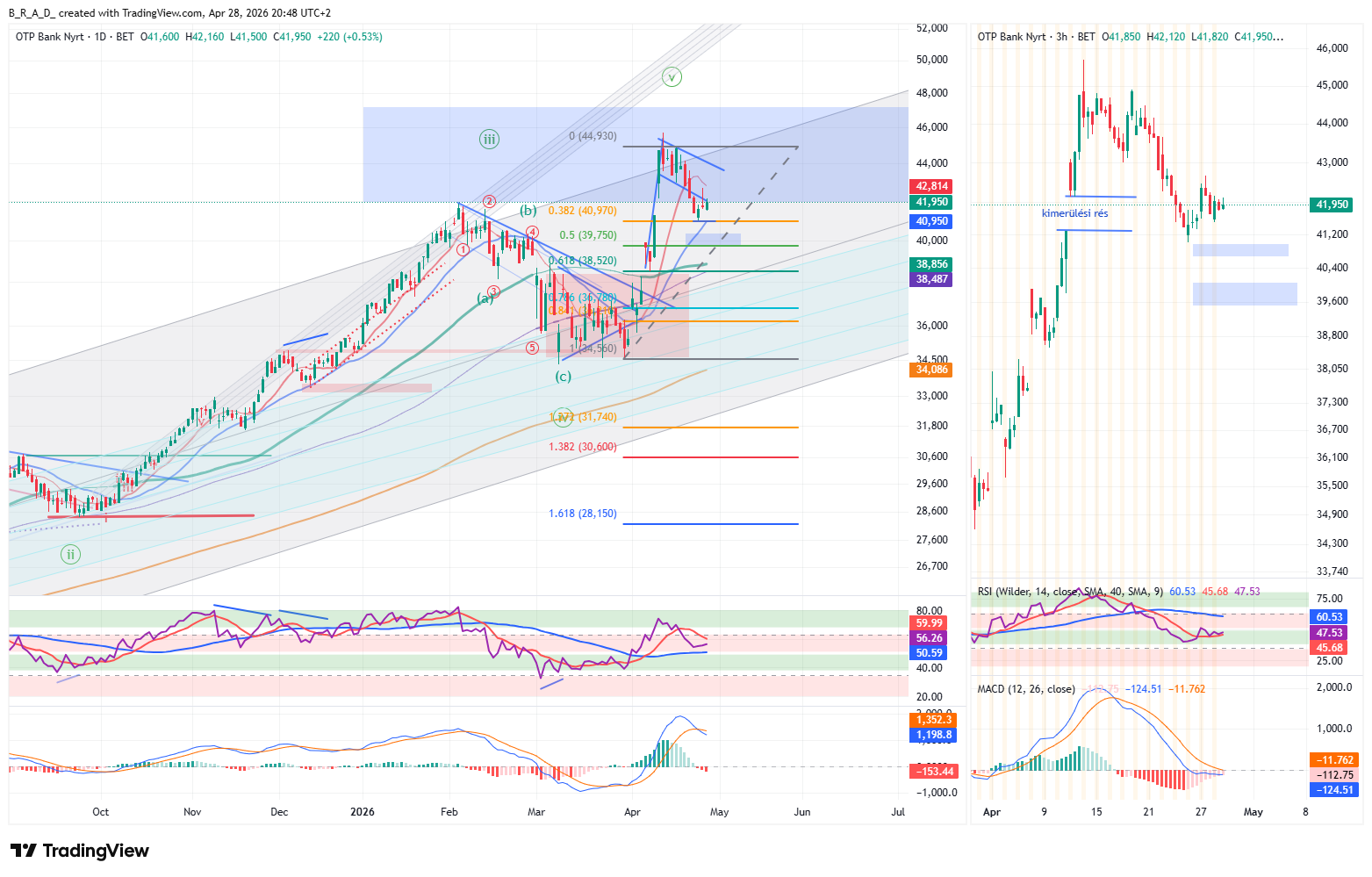 A napos MACD-n látható mozgás egy negyedik hullám képével egyezik meg, amelyet a hetes idősík képe támogat. Intraday idősíkon kialakulhat egy ZLR formáció, amely szintén arra utal, hogy a lefelé mozgás korrekció volt. A mozgás déli irányba F38-as szintig érkezett le, amely egy negyedik hullám tipikus korrekciós szintje. A megnyúló 3/5 hullám esetében az elért szint nem ideális, az inkább mélyebben, a második célzóna szintjével feleltethető meg (3h-s chart). Intraday idősíkon a felfelé mozgás szerkezete egyelőre nem támasztja alá az emelkedés lehetőségét, inkább korrekciós mozgásra utal.