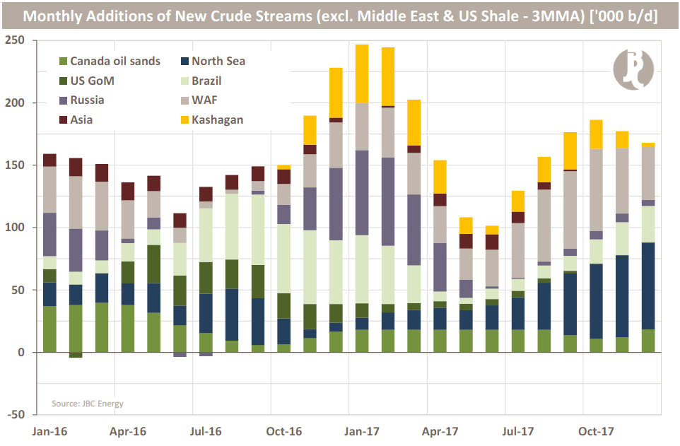 Fontos fejlemény, hogy a következő két negyedév során különösen sok új projekt kerül ki a piacra: a JBC becslése szerint havonta 250 ezer hordó/nap mértékben nő a kínálat, ami jóval magasabb, mint a korábbi 100 ezer hordó/nap érték. A kínálat teljes egésze szinte az Atlanti medencében jelenik meg, ami szintén fontos változást hozhat a globális olajszállítás irányában.