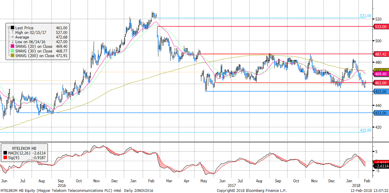 A Magyar Telekom gyakorlatilag visszatért a széles oldalazó sávba, melynek jelenleg az alján tartózkodik az árfolyam. Ha sikerülne megerősíteni a szint áttörését, akkor a közeli ellenállások hiányában akár jelentősebb emelkedés is kibontakozhat.