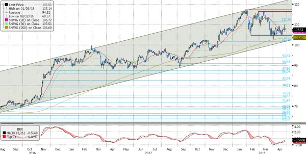 A 24 elemű index minden tagja közzétette gyorsjelentését mostanra. A profit 29,4 százalékkal emelkedett az idei első negyedévben, de az elkövetkező két negyedévben a bővülés visszafogottabb, 20 százalék lehet, míg az év végén itt is gyorsulás jöhet. Az MACD itt is vételi jelzésben van, de a negatív tartományban, azaz törékeny az emelkedés, de folytatódhat.