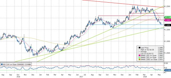 Hiába ért el a sokak által figyelt RSI indikátor a túladottságot jelző zónát az EUR/USD kurzusban, egyelőre semmiféle fordulat jelei nem láthatók a grafikonon. A komoly negatív meglepetést okozó eurozónás beszerzési menedzser indexek a gazdasági növekedés további lassulására engednek következtetni a második negyedévben, így újbóli nyomás alá került az euró. Az USA-ban a májusi BMI adatok ezzel ellentétben relatíve jók lettek, ami pedig a dollárt segíti. Ezek eredőjeként pedig inkább 1,15 felé veheti az irányt rövidtávon a kurzus. A mai napon a Fed megelőző kamatdöntő ülésének a jegyzőkönyve kerül publikálásra, amit érdemes a kurzus szempontjából figyelni.