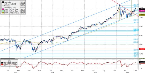 Közeledik a 2.782 pontnál található rés, amely megállíthatja az emelkedést, akár viszonylag hosszabb időre is. Mindezt annak ellenére, hogy az MACD indikátor esetében nem látunk túlvettségre utaló jeleket. Továbbra is azt gondoljuk, hogy egy éven belül 3.000 pont fölött lesz az index. Addig is a rövid távú cél az 2.812 pontnál levő rés. Így dilemmában vagyunk, mert az index tovább emelkedhet, de a hét végére már alacsonyabban zárhat a jelenlegi árfolyamnál.
