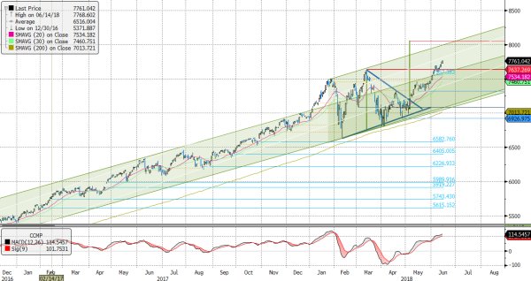 Habár a Nasdaq újabb és újabb csúcsokat dönt, ennek ellenére érik egy korrekció az árfolyamban. Ugyanis az MACD egyre inkább túlvettség jeleit mutatja. Így nem lepődnénk meg, ha a közéjövőben elindulna egy korrekció. Ugyanakkor erre még nem érkezett jelzés, így megszavazzuk a további emelkedést.