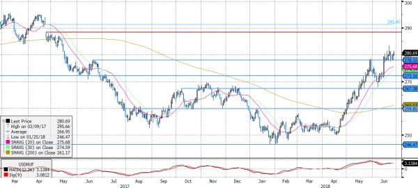 Ugyan áttörte a 278,1 forintnál lévő technikai szintet az USD/HUF kurzus, azonban ezt követően kifogyott az eddigi lendület. Ezzel további konszolidáció következhet, ami rövidtávon inkább oldalazás formájában ölthet testet, mivel a rövidtávú mozgóátlagok egyre kevesebb teret hagynak a forinterősödésnek.