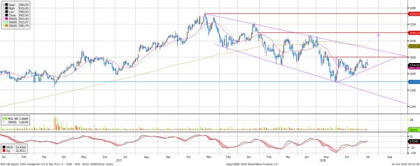 Felfelé irányuló háromszögben kereskedik az árfolyam, amiből kitörés esetén akár 3100-ig is emelkedhet az árfolyam, ami megyezik a januári gap tetejével.