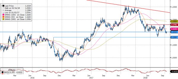 Egyre kevésbé gyakorol nyomást az olasz költségvetési helyzet az euró árfolyamának alakulására, ezáltal az 1,15-ös technikai szint megállította az EUR/USD kurzus csökkenését. Innen azonban egyelőre nem következett be fordulat, mivel a hozamkülönbség az amerikai és európai államkötvények között tovább nő. Amíg pedig ez változatlan marad az 1,13-as szint felé húzhat a kurzus.