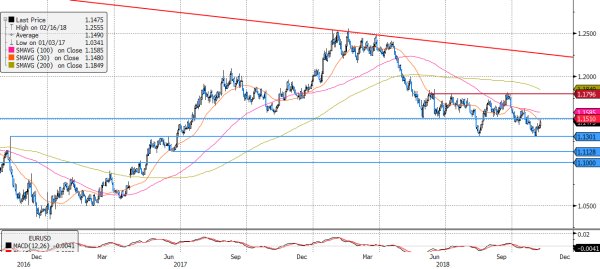 Noha az amerikai hozamok csökkenése nyomán gyengüléssel reagált a dollár az euróval szemben az időközi választások végeredményére, hosszabb távon a növekvő költségvetési szigor pozitívum lehet a zöldhasúra nézve. Eközben ráadásul az USA gazdasága továbbra is dübörög, míg a friss eurozónás beszerzési menedzser indexek a növekedési ütem további lassulásáról tanúskodnak. Ráadásul az eurozóna jelenlegi feketebáránya, Olaszország esetén már 50 alatti értékeket láthattunk októberre. Ehhez pedig hozzájön az ottani költségvetés körüli huzavona, így ez összességében továbbra is szembeszelet jelenthet az eurónak. Az EUR/USD kurzus jelenleg az 1,15-ös technikai szintet teszteli, ám ahogy a befektetők megemésztették az amerikai választásokat és ismét majd az európai bajokra fókuszálnak, könnyen ismét 1,13 felé vehetjük az irányt.