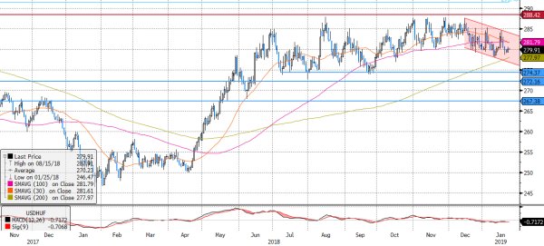 Alulról 278 forintnál a 200 napos, míg felülről 282 forintnál a 30 és 100 napos mozgóátlagok fogják közre a kurzust, ezáltal rövidtávon szűk sávot teremtvén a további elmozdulásra.