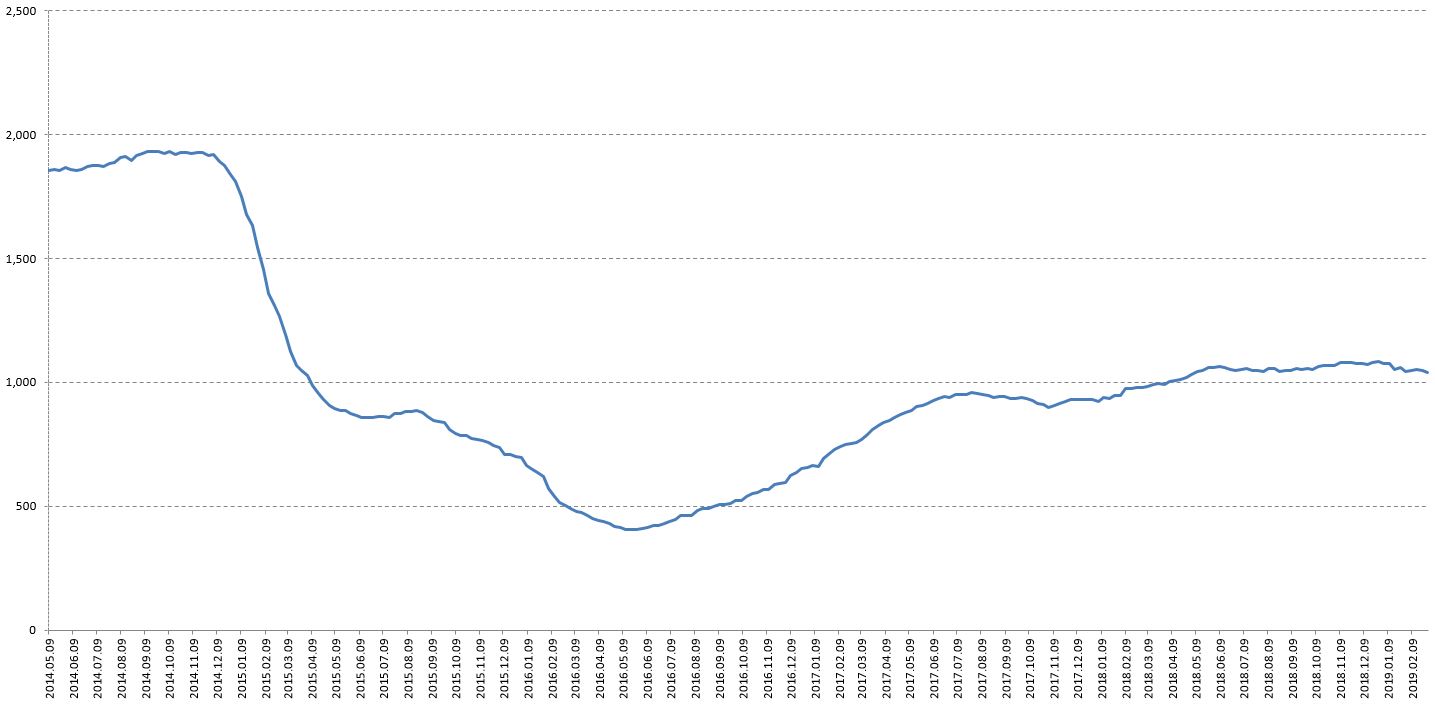 Az USA fúróberendezés szám alakulása 2014. májusa óta