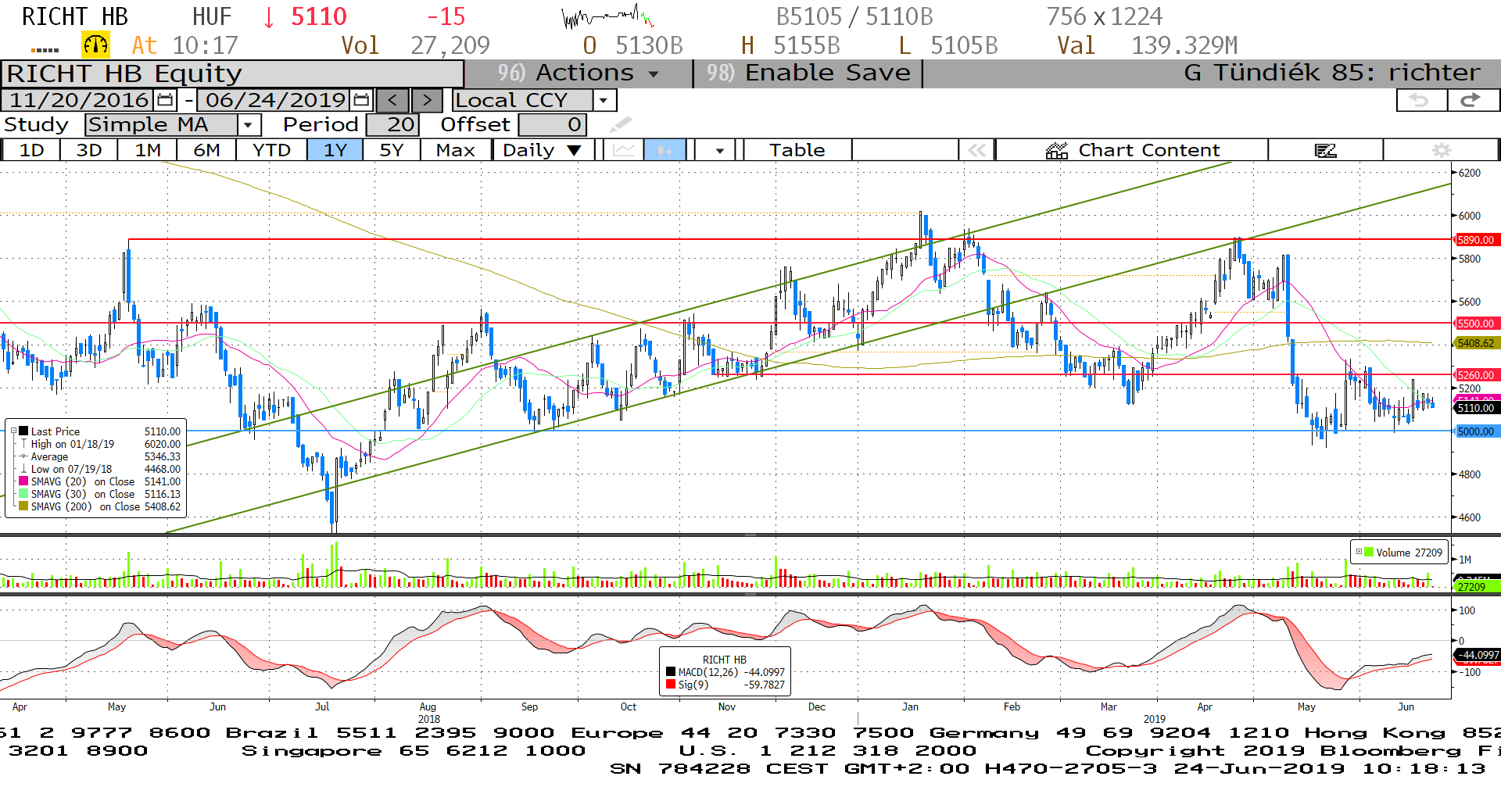 Nem tud egyértelmű irány kialakulni a Richternél, bár egy minimálisan emelkedő mozgás azért megfigyelhető. A közeljövőben is az oldalazó mozgásé lehet a főszerep az 5.000 és 5.260 forint közötti meglehetősen széles sávban.