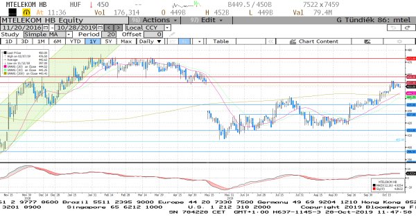 A májusi osztalékrésig emelkedett a Magyar Telekom árfolyama, azonban nem sikerült leküzdenie az ellenállást. Jelenleg a 453 forint jelentette támasz alatt oldalazik az árfolyam, de várhatóan nem marad sokáig ilyen nyugodt a kereskedés, hiszen a következő hetekben fontos események várhatók az MTel háza táján. Egyrészt jövő héten publikálja negyedéves eredményét, másrészt a következő hetekben várhatóan kiderülnek az 5G tender eredményei is. Ellenállások 453 és 458 forintnál láthatóak, míg támaszt a 200 napos mozgóátlag jelenthet.