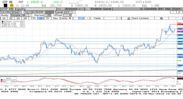 A 20 napos mozgóátlag visszatesztelését követően ismét emelkedésnek indult az OTP árfolyama és ma a 14.000 forintos szinttel küzd az árfolyam, egyelőre sikerrel. Amennyiben sikerülne a szint fölött zárnia az OTP-nek, akkor a következő napokban akár újabb csúcstámadás is következhetne, ráadásul úgy, hogy közben az MACD még korrekciós periódusban van.