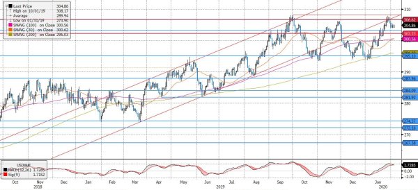 Visszatesztelte a kurzus az emelkedő trendcsatorna tetejét, ahonnan egyelőre lefordulás látható. Rövidtávon a mozgást a 302,2 és...